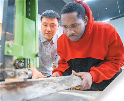 近日,在浙江廣廈建設職業技術大學工藝美術學院裡,10余名非洲留學生參加了家具結構技術實訓課。教師金鴻良向學生們講授材料特性、開料、機器使用、家具特征、榫卯工藝等工序內容,學生們分批嘗試開料、打磨等步驟。 |