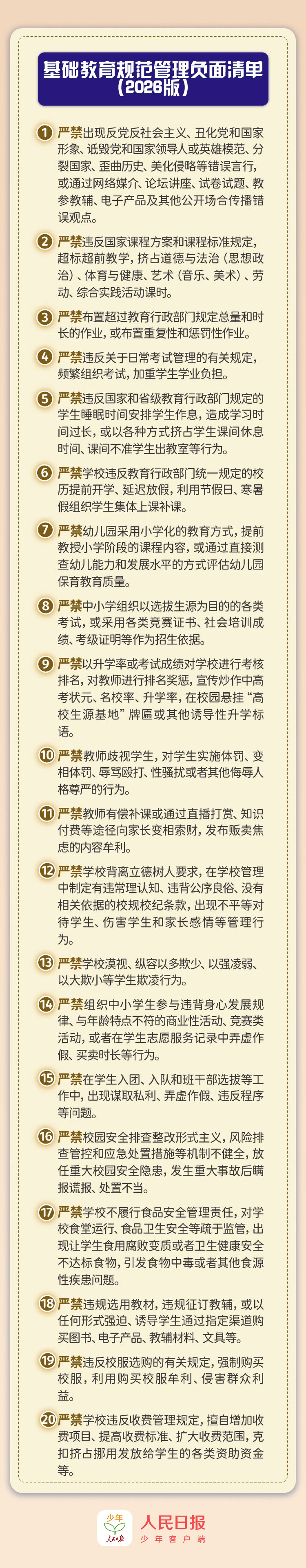 通知提出20條負面清單,針對影響政治安全、影響教育公平、影響學生身心健康、造成課業負擔過重、師德失范、侵害群眾利益等六類問題,明確禁止相關行為。