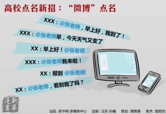 电脑机房传来一阵敲击键盘的声音。 @张老师:“早上好,我到了”;@张老师:“早,今天天气又变了”。在张厚远老师的电脑屏幕上,各式各样的签到不停地在滚动,之后老师再通过备注的名称核对人数,这样微博点名就算完成了。