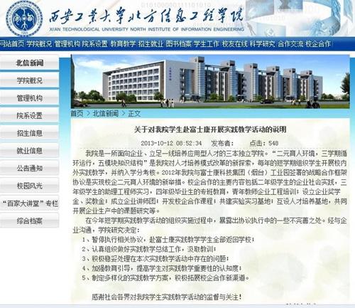北方信息工程学院官方网站刊登该校学生赴富士康开展实践教学活动的情况说明