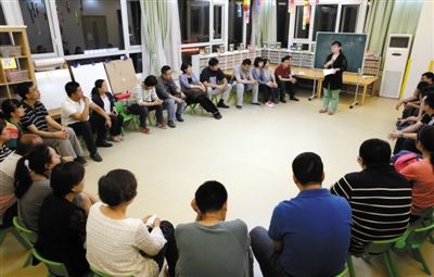 昨晚7时许,“老师打人”班级的孩子家长们,在当事幼儿园集中接受心理专家的心理疏导,他们也将获得如何帮助孩子们度过被打阴影的指导。 A08-A09版摄影/新京报记者 尹亚飞 高玮