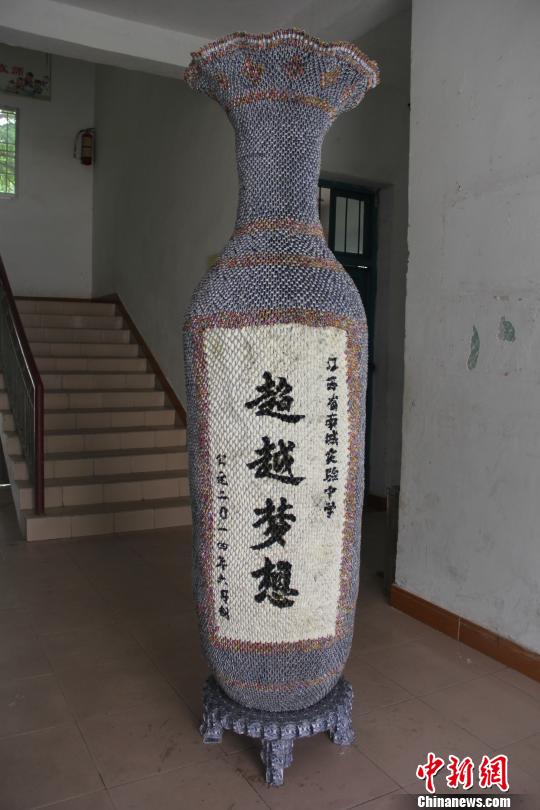 吴小文称,艺术花瓶身中央文字为“超越梦想”,这个花瓶高约2.14米,寓意为“2014年”,寄予了全校师生对学校2014届中考取得优异成绩的美好期望与祝愿。