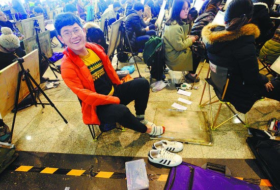2月16日,2016年山东工艺美术学院招生专业考试在济南舜耕国际会展中心开考,在众多考生中,没有双臂的考生张晗格外引人注目。张晗来自山东省德州市乐陵县,小时不慎触到了变压器,最终痛失双臂。住院一年后,张晗再次回到学校,开始用双脚学写字、翻书、穿衣、骑自行车。张晗的妈妈说,张晗很坚强,也很乐观,他喜欢画画、设计,希望通过艺考,圆自己的大学梦。