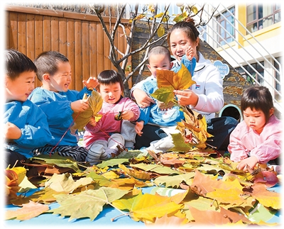 2025年11月6日,在山东省济宁市任兴托幼一体实验园,老师陪伴托育班的小朋友做游戏。 |